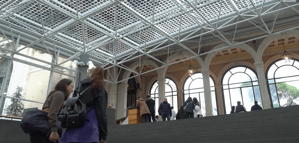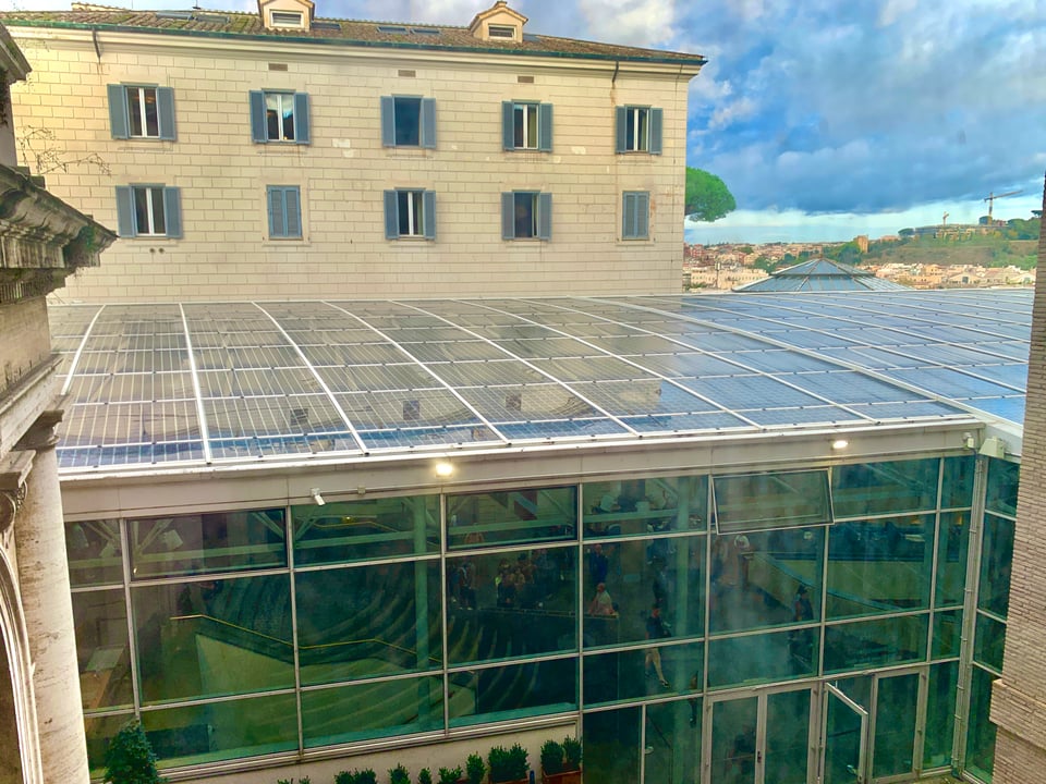 My second reaction was, damn that’s a gorgeous installation. This is mainly due to the use of photovoltaic glass panels which sandwich the solar cells in between two layers of glass, held together with invisible adhesive. Rather than install conventional solar panels on top of a roofing structure, the Vatican used these glass panels as the structural roofing material. They filter out much of the sun’s heat while letting sunlight through, reducing the need for daytime lighting. So they generate electricity while reducing the need for cooling and lighting. The esthetic impact inside is wonderfully bright and refreshingly modern: